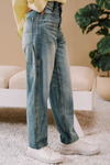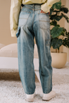 Jeans with an adjustable waistband and five pockets with front zip and metal button closure