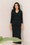Tailored design with a flattering three quarter sleeve, V-neckline elevating into high neck at back. Features a gathered waist and side slit at hem for a polished, put-together look.