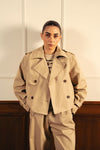 - Features a double-breasted front with notched collar and belted cuffs for a refined, classic touch
